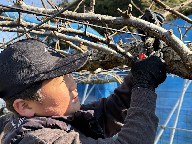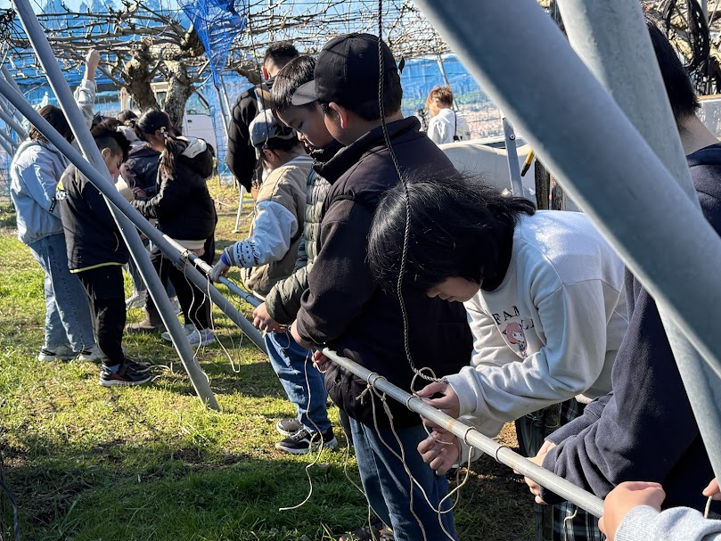 恒例になりました 千葉県館山市立九重小学校の生徒さんの梨づくり体験事業の一コマ 剪作業に 20有余人の生徒が、我が大清水農園の第2圃場に来てくれた 学校から2km離れているので新年早々の遠足? お疲れかと思うが 早速生徒代表からしっかりした挨拶からはじり 生徒さんは私共スタッフの言う事を聞いて 頑張って不要な枝を削除してくれた 枝を整枝した後 誘引作業 麻の入った紐で縛るのですが (男結び)なかなか難しそうだったが 生徒さんは頑張って挑戦していた。